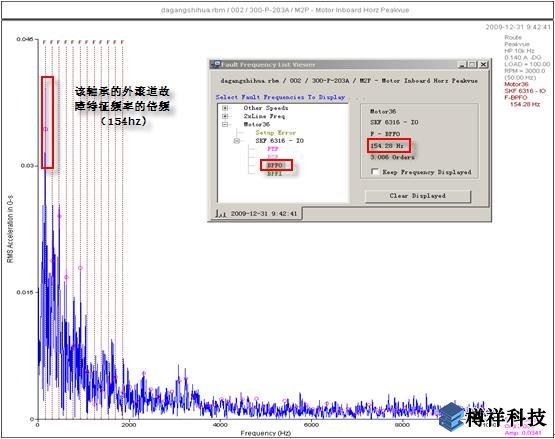 在2009年12月10號,三聯(lián)合強(qiáng)制循環(huán)熱水泵P-2103/1監(jiān)測中發(fā)現(xiàn)該泵電機(jī)軸承雜音大,電機(jī)遠(yuǎn)端軸承的Peakvue值從之前的0.2突然長到2.5,時域波形有明顯的沖擊,存在明顯的軸承保持架故障特征頻率。如下圖所示