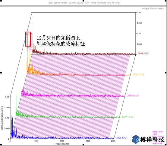 判斷為該泵電機(jī)遠(yuǎn)端軸承保持架磨損,顯示出保持架有損壞,測試中有沖擊,現(xiàn)場聽到明顯雜音,建議車間停泵修理。