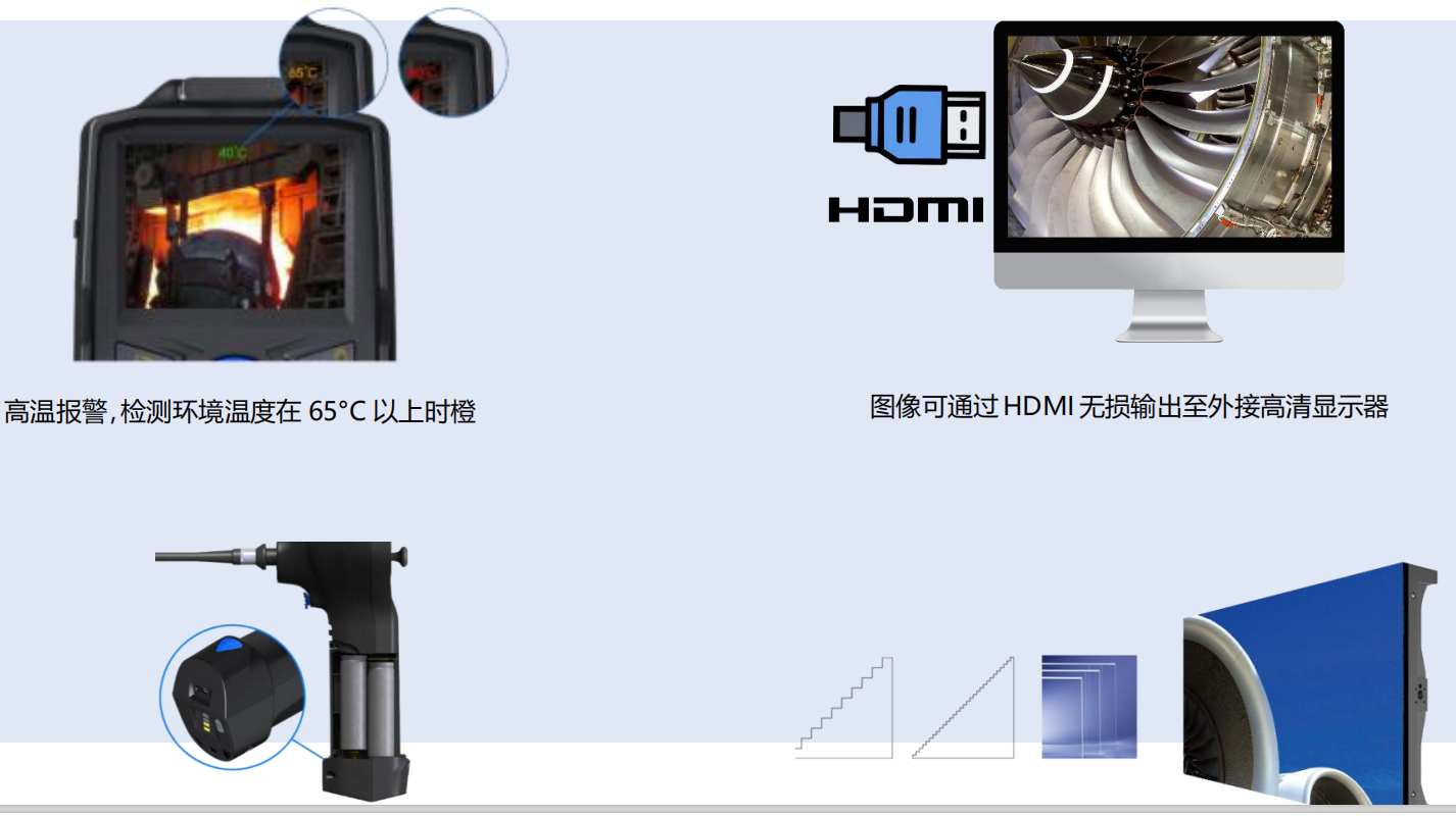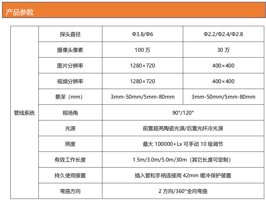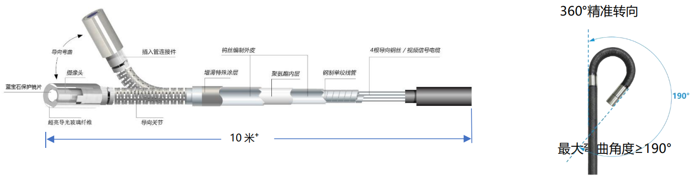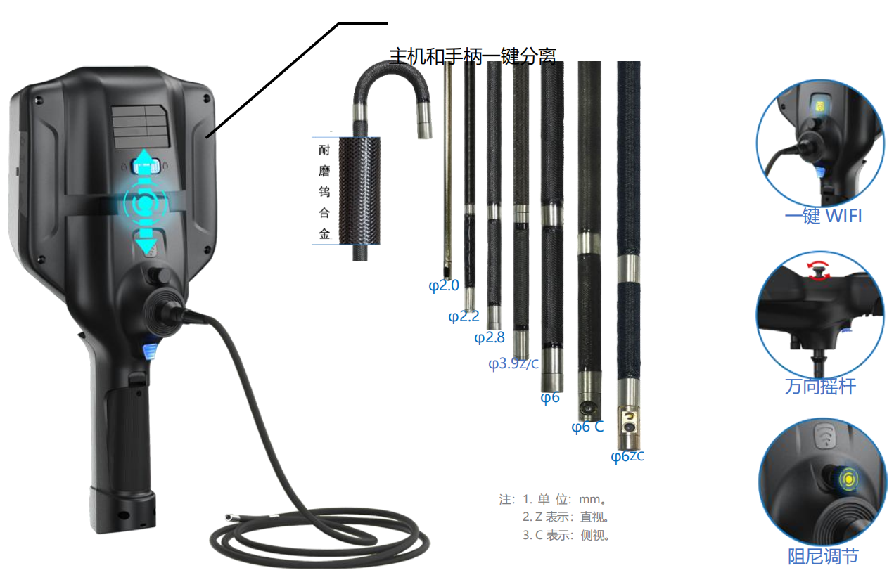 ***清內窺鏡采用模塊化設計,主機與手柄可一鍵分離。并且兼容 2.0mm/2.2mm/2.8mm/3.9mm/6mm 的管線系統(tǒng),同時也兼容 3.9mm 側視管線、6mm 側視管線、6mm 直側視管線。產品幾乎滿足了各種檢測現(xiàn)場的需求。
