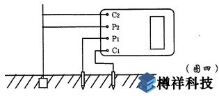 2、測量保護(hù)接地電阻時(shí),一定要斷開電氣設(shè)備與電源連接點(diǎn)。在測量小于1Ω的接地電阻時(shí),應(yīng)分別用專用導(dǎo)線連在接地體上,C2在外側(cè)P2在內(nèi)側(cè)如圖四所示: