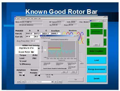 在另一項(xiàng)實(shí)驗(yàn)室控制的研究中,使用動(dòng)態(tài)測(cè)試儀徹底測(cè)試了在小型測(cè)力計(jì)上滿負(fù)荷運(yùn)行的1馬力電動(dòng)機(jī)。然后保存并分析結(jié)果。移除轉(zhuǎn)子,并通過(guò)一個(gè)轉(zhuǎn)子條鉆出一個(gè)5/8英寸的孔,將其完全切斷。電動(dòng)機(jī)在相同條件下組裝和重新測(cè)試。再次,保存結(jié)果,然后與原始數(shù)據(jù)進(jìn)行比較(圖4和5)。